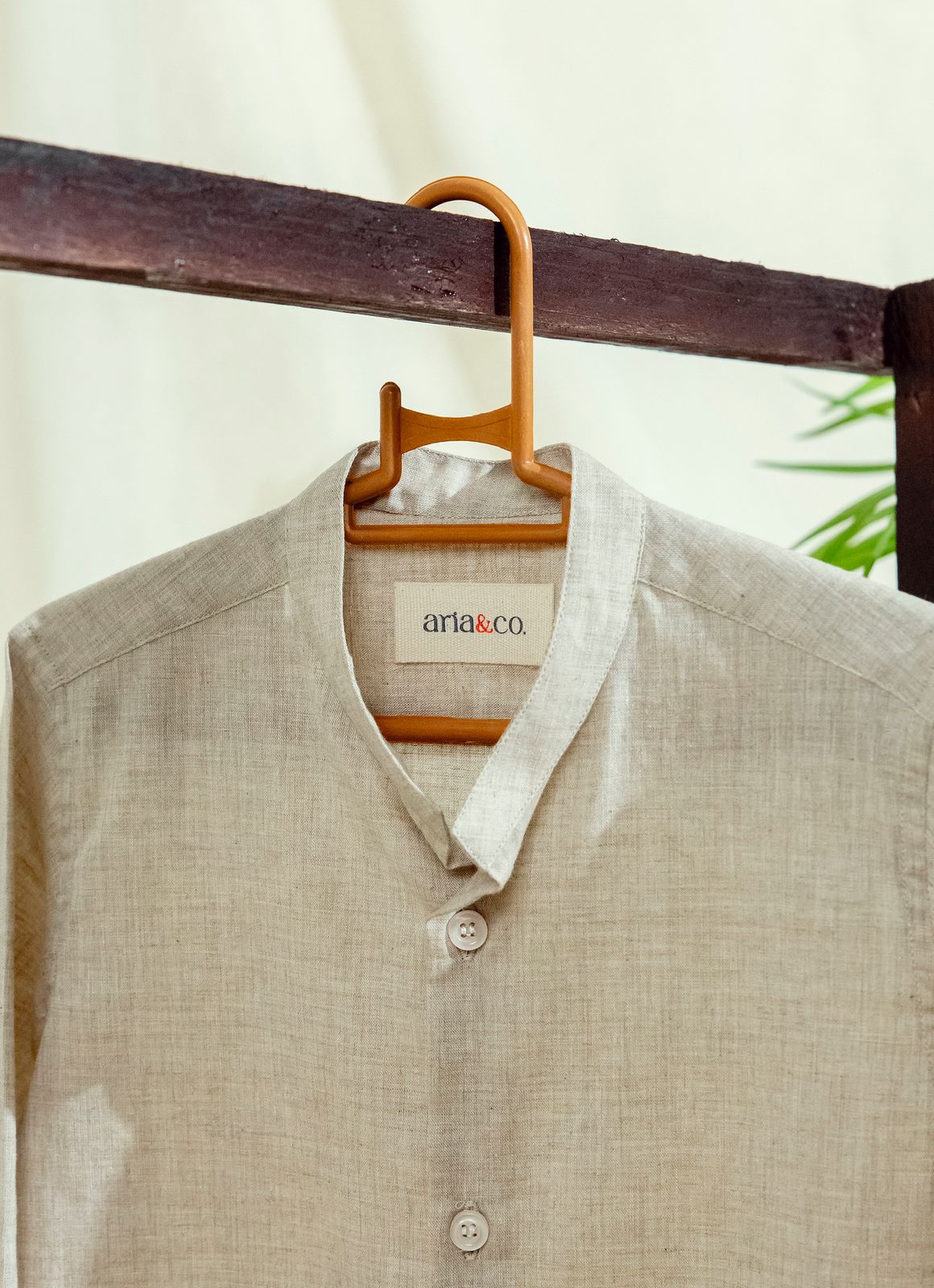 This Beige Lenin Shirt is a formal yet comfortable choice for babies. The breathable lenin fabric provides a lightweight and soft feel for your little one's delicate skin. Perfect for special occasions or everyday wear.
