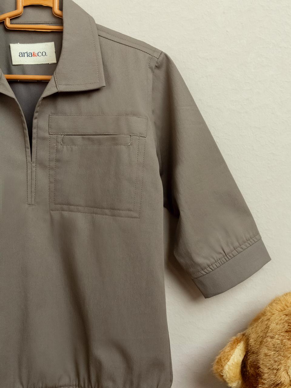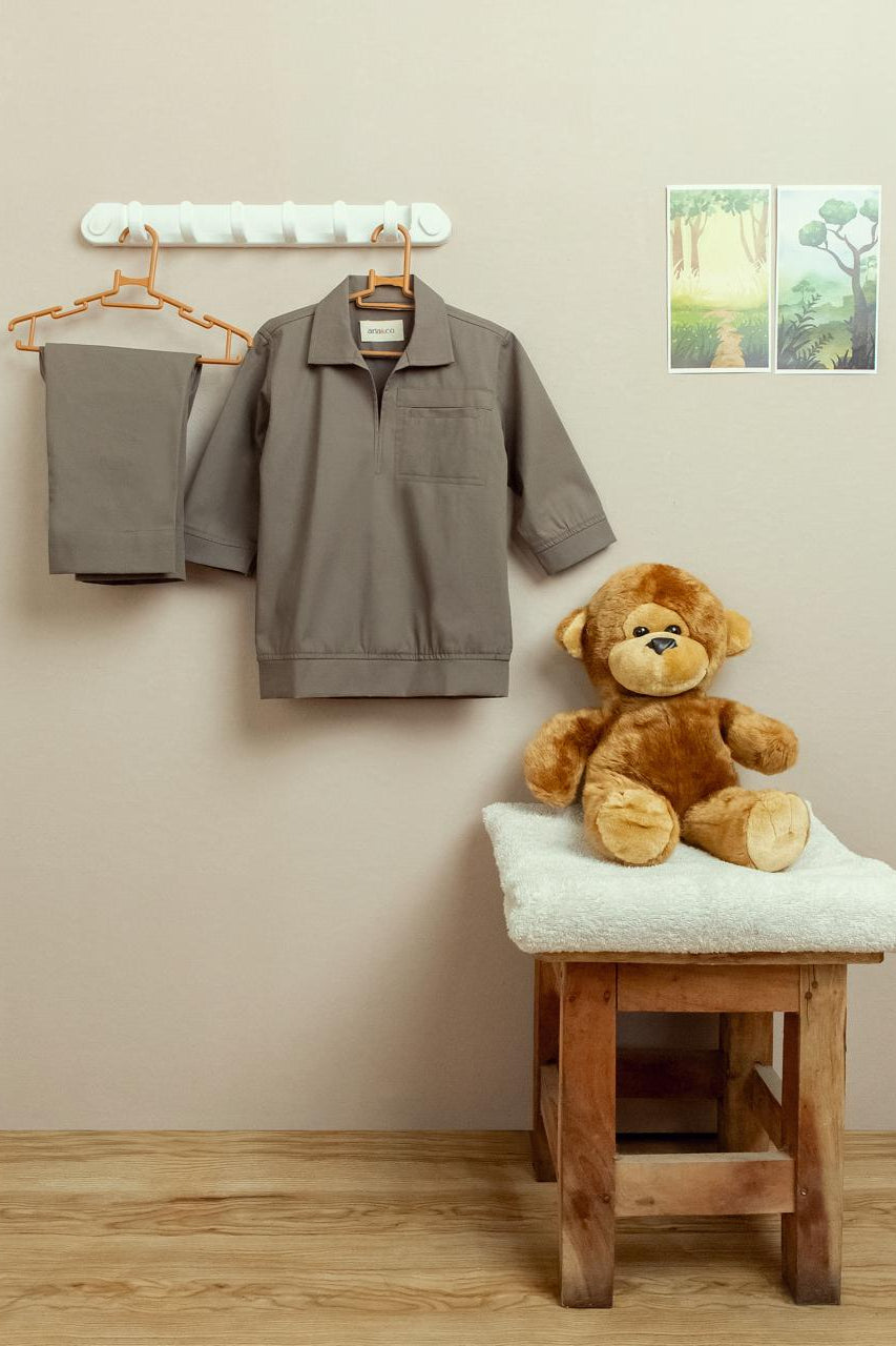 This two-piece set in a soft taupe color is simple and stylish. With a half-zip collared top and straight-cut trousers, it’s perfect for a clean, modern look